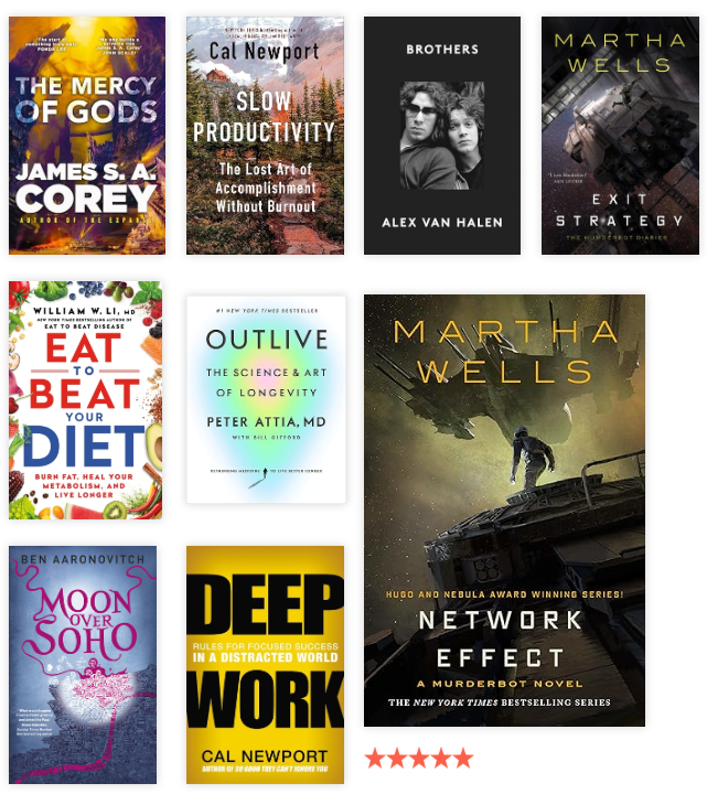 Martha Wells’ Murderbot Diaries follows a self-aware security unit that’s hacked its own governor module so it can binge-watch soap operas instead of obeying orders, yet it keeps getting dragged into saving the humans it pretends not to care about. Sarcastic, socially anxious, and quietly compassionate, “Murderbot” uncovers corporate corruption, deadly conspiracies, and the meaning of autonomy while navigating friendships it never asked for. The series blends sharp humor, action, and heartfelt character work as Murderbot figures out what it means to be a person, without admitting that’s what it’s doing. The series is just fantastic and fun, and quick reads. I recommend reading the first book before watching the hit Apple show, which is also quite good and has successfully captured the spirit of the Murderbot Diaries.